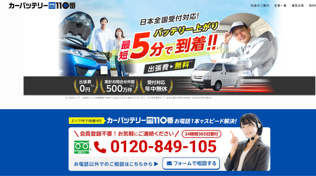 カーバッテリー110番は、全国展開しているロードサービス業者で、東大阪市内でも迅速な対応が可能です。見積もりがわずか10秒で提示されるだけでなく、出張費は0円のため、コストを抑えたい方にも適しています。